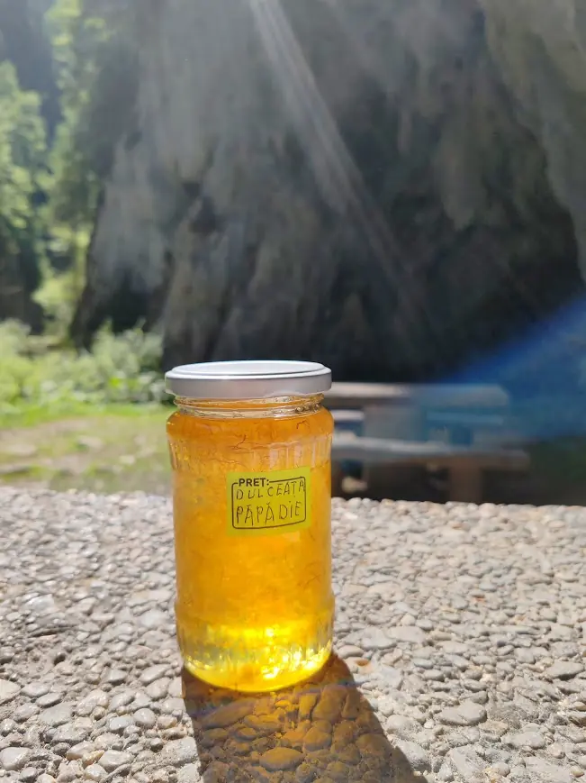 Am mai admirat pereții peșterii, contrastul dintre cer și tavanul ei, am mai schimbat câteva vorbe cu ceilalți turiști, am făcut câteva poze și m-am întors la tanti Sabina. Din interacțiunea cu ea am ieșit mai bogată – mi-am luat o minune de dulceață de păpădie. O frântură aurie de vară catifelată ca petalele din interiorul borcanului.