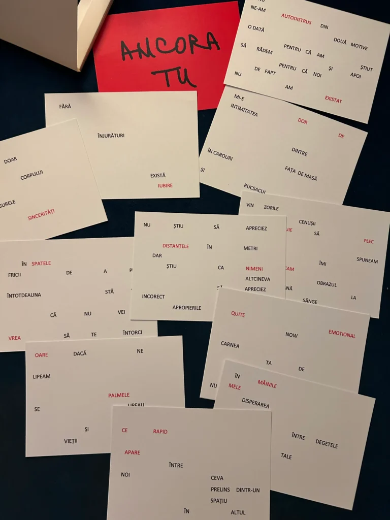Am dorit să evidențiez impactul pe care îl are indiferența epocii care marginalizează prin trasarea unor coordonate anumite categorii, condamnâdu-i indirect pe cei care fac parte din ele la singurătate și neîncredere. Apoi setul Ancora Tu, un set de cărți poștale cu versuri din poemele mele, creat cu scopul de a face ca poezia să ajungă la oameni, într-o formă mai „digerabilă”.